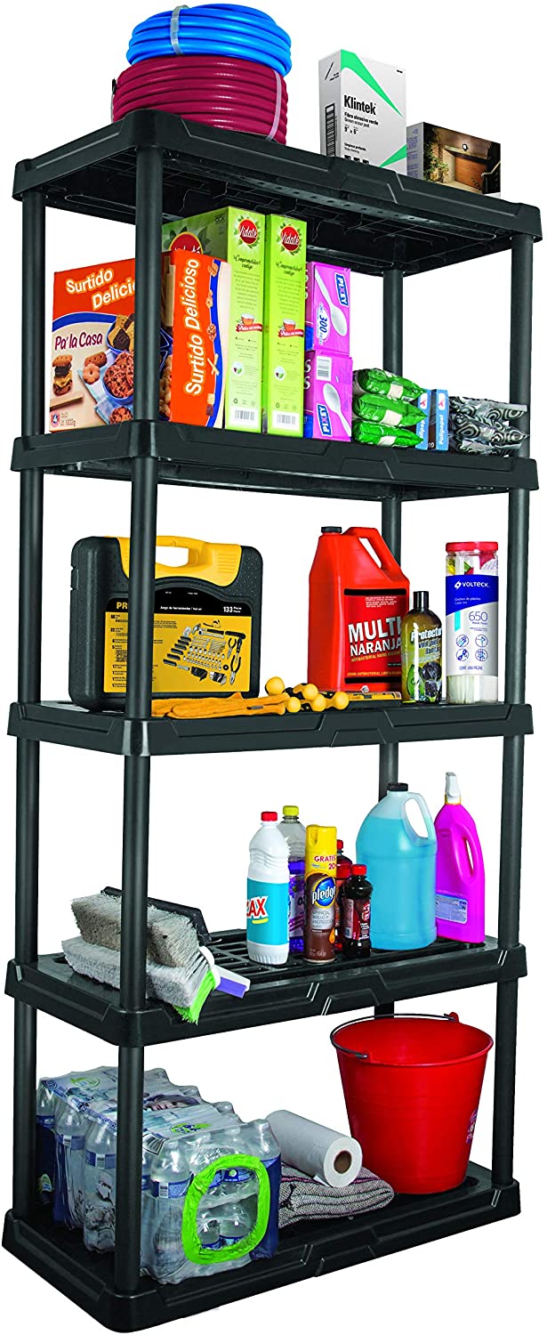 Estante plástico de 5 repisas. Fabricado en polipropileno. Repisas ventiladas para áreas de alta humedad. Capacidad de carga distribuida uniformemente. No se requiere herramienta para el ensamble. El peso máximo recomendado calculado con la carga distribuida uniformemente. Especificaciones: capacidad máxima de carga por estante 175 kg, capacidad máxima de carga por repisa 35 kg, ancho 36" (92 cm), alto 73" (185 cm), fondo 17" (44 cm), peso 8.7 kg.