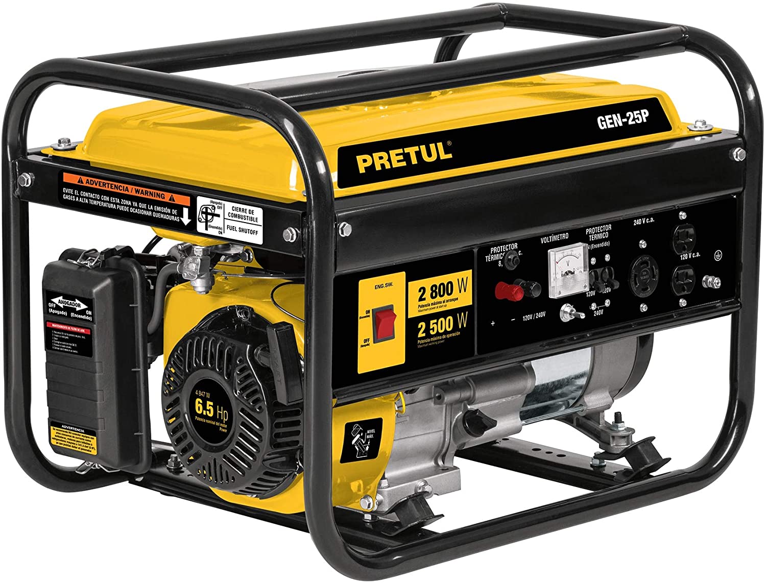 Generador eléctrico a gasolina, 2,500 w, Pretul. Motor OHV a 4 tiempos de alto desempeño No requiere mezcla de aceite y gasolina. Arranque manual (cuerda retráctil). Protección desobrecarga. MAP Sensor, compensador de altura. Duracion del tanque a trabajo continuo. 120 V CA. 240 VCA. 12 V Para carga de batería.