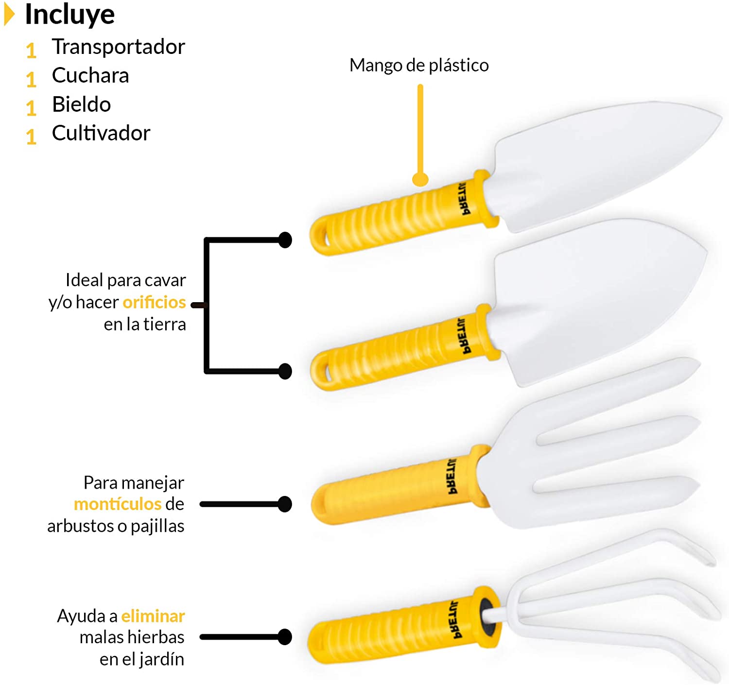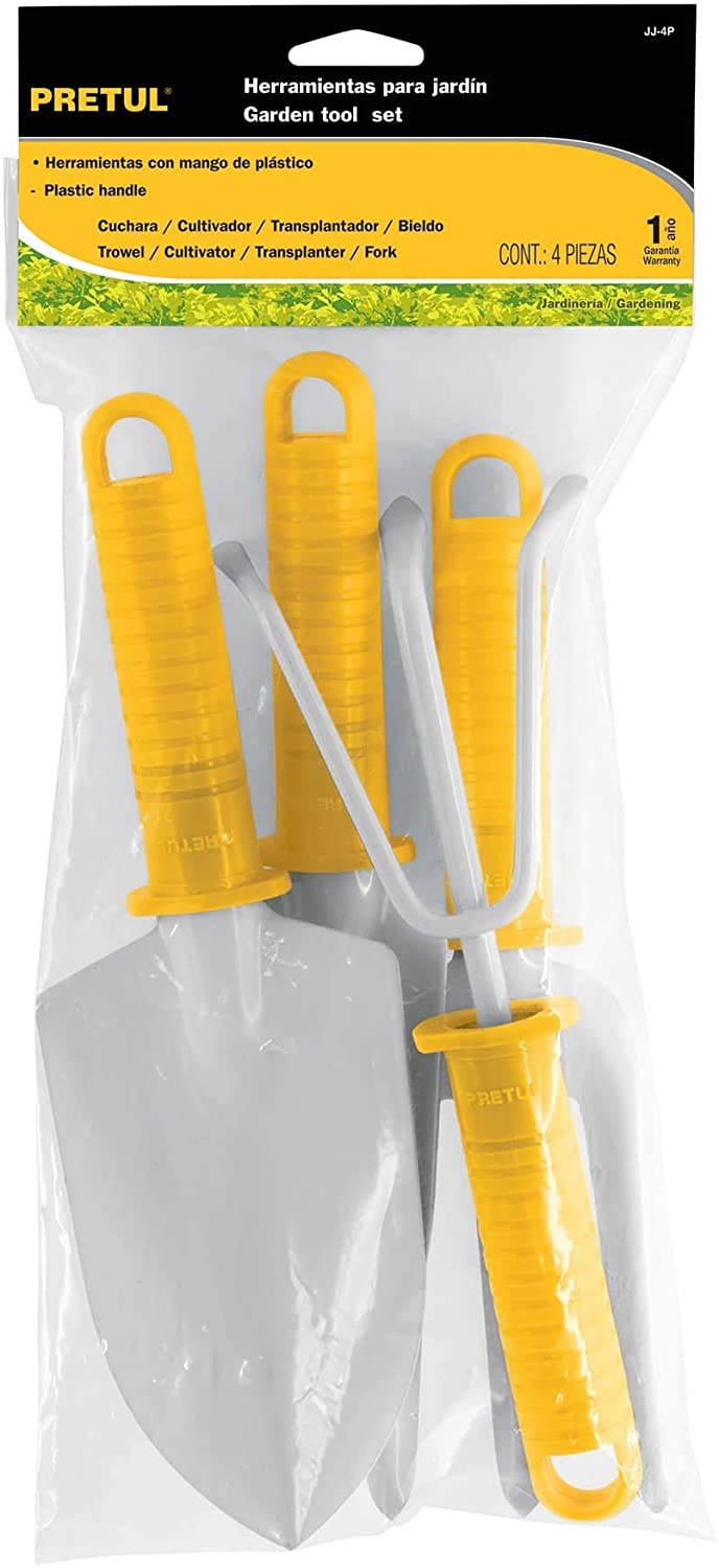 Juego de 4 herramientas para jardinería con cómodos mangos de polipropileno. Fabricadas en lámina de acero con recubrimiento de pintura de esmalte que los protege de la oxidación. Especificaciones: 1 bleido de 26cm de largo, 1 cuchara de 25.6cm de largo, 1 cultivador de 22cm de largo con uñas de 6.5mm de diámetro, 1 transplantador de 26.5 de largo, peso total 412g.