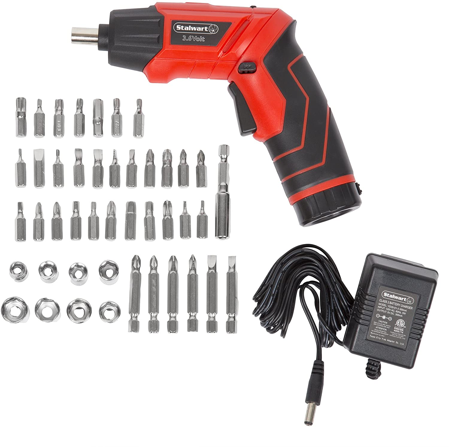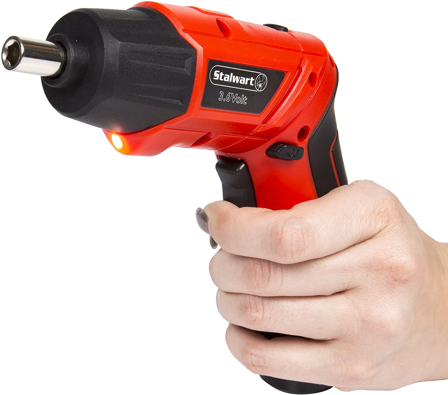 Compacto pero potente, este juego de destornilladores inalámbricos de 3,6 voltios de 45 piezas de Stalwart es todo lo que necesita para proyectos domésticos sencillos. Este juego ofrece un valor fantástico, ya que incluye muchas de las puntas y vasos más comunes. Varias de las puntas son de longitud extendida para las áreas más difíciles de alcanzar. El atornillador inalámbrico de 3,6 voltios, totalmente recargable, tiene muchas características útiles, incluyendo dos linternas LED y una empuñadura giratoria, que le permite cambiar fácilmente de la empuñadura de pistola a la recta proporcionando una verdadera flexibilidad en el trabajo. El sistema de accionamiento incluye avance, punto muerto y marcha atrás con sólo pulsar un botón. La brillante luz LED integrada en la sección de accionamiento frontal se enciende cuando se aprieta el gatillo para iluminar el objeto en el que se está trabajando. La segunda luz LED es una linterna integrada en la parte inferior del mango. ¡Esto le da una manera realmente conveniente para iluminar un área sin tener que ir a buscar una linterna por separado! Incluye: Destornillador, cargador, alargador de puntas de 2 pulgadas, 4 - puntas de cabeza Phillips extendidas de 2 pulgadas, 2 - puntas de cabeza plana extendidas de 2 pulgadas, 8 - puntas hexagonales, 5 - puntas de cabeza plana, 8 - puntas de cabeza Phillips, 7 - puntas Torx, 8 - llaves de vaso métricas de 1/4" (13mm, 11mm, 12mm, 10mm, 9mm, 8mm, 7mm, 6mm), convertidor de puntas, maletín robusto de polipropileno. Empuñadura giratoria que cambia de estilo pistola a empuñadura recta.